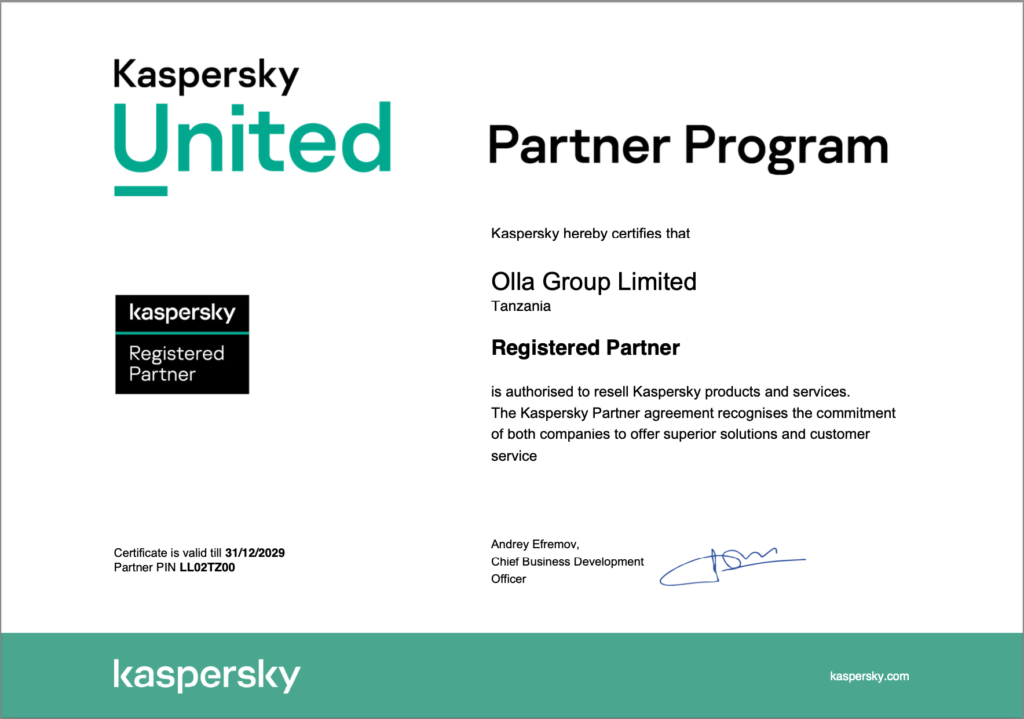 Kaspersky, a leading provider of cybersecurity solutions, hereby certifies that Olla Tanzania (Registered Partner) is authorized to resell Kaspersky products and services. As a Registered Partner, Olla Tanzania has demonstrated a deep understanding of Kaspersky’s solutions and has the expertise to implement them in your organization. At Olla Tanzania, we are committed to providing our […]